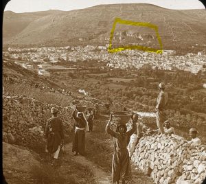 Old picture with a view to Eival from Gerizim, highlighted area is the natural indentation in the mountain