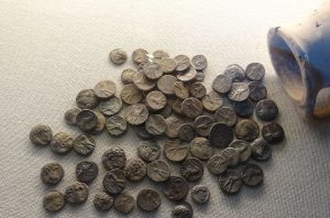 Coin hoard discovered at Usafiya in the Carmel, containing many Tyrian shekels and half shekels