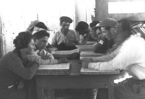 Pioneer members of the organization that founded Kvutzat Yavne in southern Israel studying Gemara in the 1930s