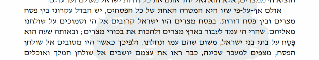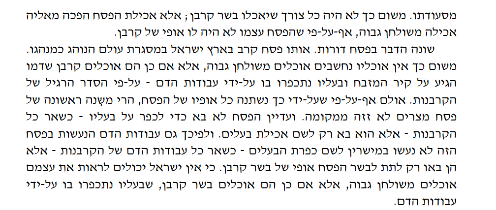 There is an essential difference between the paschal lamb in Egypt and in future generations. For the paschal lamb in Egypt, the Israelites were close to God and were able to feel that they were at God’s table on their own, for God was going to pass in the land of Egypt and to strike the Egyptian firstborn. And at the time, God skipped over/protected the houses of the Children of Israel, because they are God’s nation and inheritance. Therefore, when they were sitting around the paschal table, awaiting God’s passing through – so they already saw themselves sitting at God’s table and eating of God’s meal.