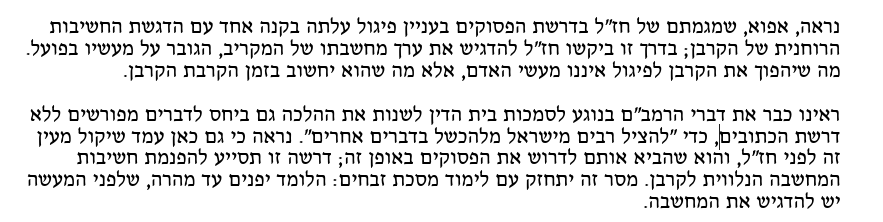 It seems then that Chazal’s inclination in their interpretation of the verses regarding piggul fits in well with this idea. In this way, Chazal tried to emphasize the value of the intentions of the one offering the sacrifices, which are more important than his actual actions. What turns an offering into a piggul is not what a person does, but what he thinks about at the time of the offering. We have already seen what the Rambam says regarding the High Court’s authority to change a law even in the case of explicit regulations that are not based on interpretations of the verses, “in order to bring back the multitudes to religion and save them from general religious laxity.” It would appear that here too a consideration of this sort stood before Chazal and brought them to interpret the verses as they did, in order to internalize the importance of the intentions that accompany sacrifices. This message is reinforced by a study of Massekhet Zevachim: such study quickly brings home the idea that greater emphasis should be placed on a person’s intentions than on his actions.