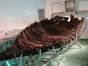 Fishing on the Kinneret certainly was a common occupation. In the excavation of the town of Migdal, just north of Tiberias, archaeologists found basins that were used to salt and preserve fish, the fish that was caught meters away in the Kinneret. In fact, Josephus tells us that Migdal’s name in Greek was Tarichaea, which means salted fish, and it is called in our sources Migdal Nunia, nun being the Aramaic word for fish. In the New Testament, when Jesus goes in search of disciples, he finds two men, Simon and Andrew, fishing on the Kinneret. He tells them to join him and instead to become “fishers of men,” i.e., teachers of his new ideas to the masses (Matthew 4:19). In 1986, in a drought year, the remains of a two thousand-year old wooden fishing boat were discovered in the Kinneret. It was dubbed the Jesus boat, and was preserved and displayed in a museum in Ginossar: