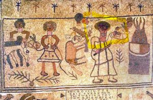 And what about depictions of Jews in art? Most of Jewish figures depicted in Talmudic period synagogues do not have their head covered. In the images of Akeidat Yitzchak in Bet Alfa, Abraham does not wear a hat though he does seem to be sporting a halo:
